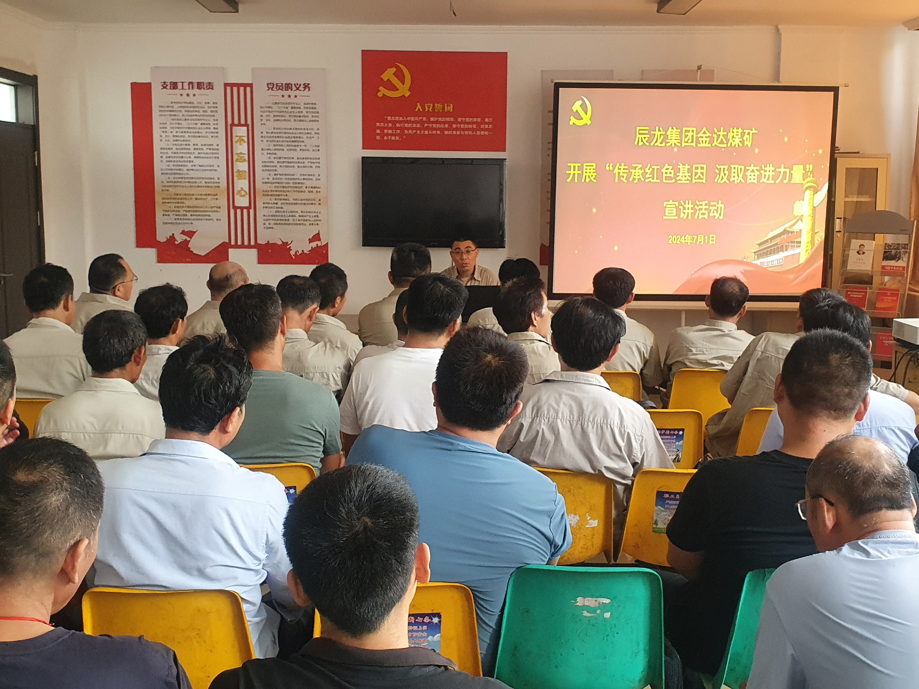 為慶祝中國共產(chǎn)黨成立103周年,進一步激勵黨員干部職工堅定理想信念、勇于擔(dān)當,干實事、有作為。7月1日,金達煤礦以“傳承紅色基因 汲取奮進力量”為主題開展宣講,公司綜掘一線黨員干部職工30余人聆聽了宣講。